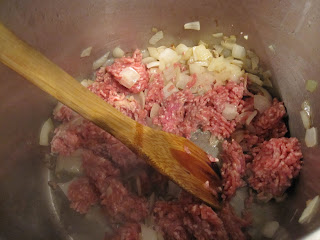 Add the 1 tbsp of olive oil to a large saucepan and add the onions and lamb, browning.